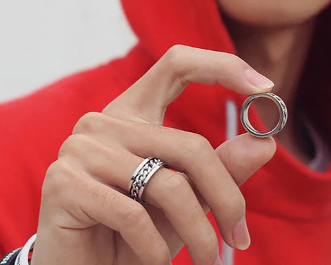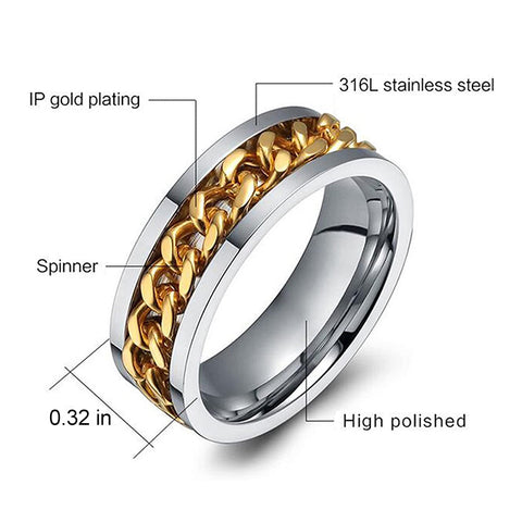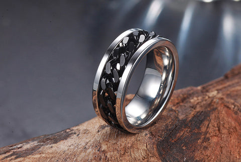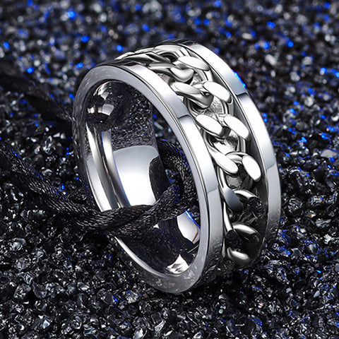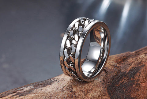 This ring is characterized by an inner ring fixed on the main chain belt, which can be manually rotated. This is a very interesting ring. It is a stylish design suitable for daily use and is very suitable as a tool to relieve stress, especially for mania Or restless people.